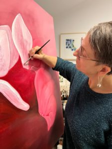 Cette lumineuse artiste peintre ne peut concevoir son art sans la Présence divine; à l’âge de seize ans, lors d’un camp dans le Sud de la France, elle fait l’expérience « d’une rencontre avec Dieu alors qu’elle est en pleine crise d’adolescence ». Un chemin de foi commence alors pour elle. Il se poursuit aujourd’hui et s’exprime au travers des peintures qui ne cessent de jaillir des pinceaux de l’artiste. « Je ne peux pas survivre sans Dieu, s’exclame-t-elle en riant. J’ai besoin de lui! Même quand je peins, j’écoute de la musique qui parle de lui, parfois je chante, je prie… Et il m’arrive aussi de pleurer devant mes tableaux! Je me dis: mais comment j’ai réussi à faire ça? J’ai l’impression parfois que Dieu prend mes mains, qu’il prend qui je suis et que c’est lui qui me fait poser tout cela sur la toile ».